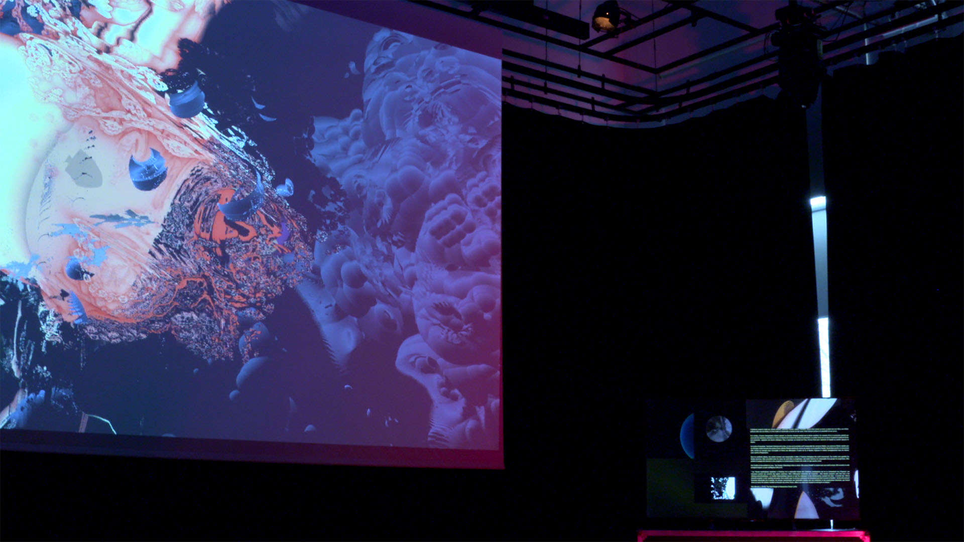 Dans cette performance, j’explore les liens interactionnels et trans-génératifs entre l’humain et la machine par le biais d’une performance musicale visuelle. Je crée un scénario co-relationniste induit par mes actions dans un « milieu » technique. J’active un monde narratif fractal post-psychédélique, méta-sonique et abstrait, rendu possible par les interactions humaines/machines.