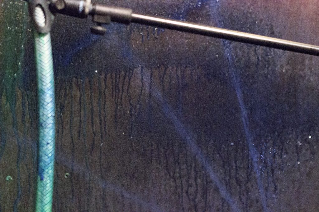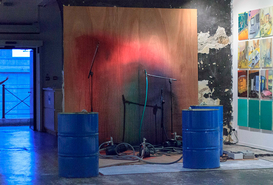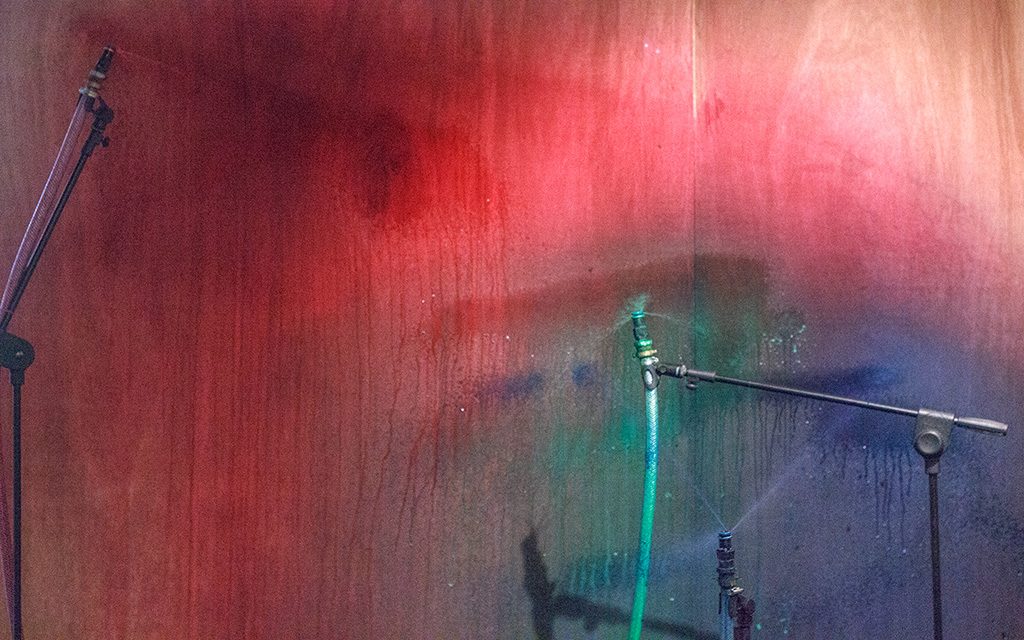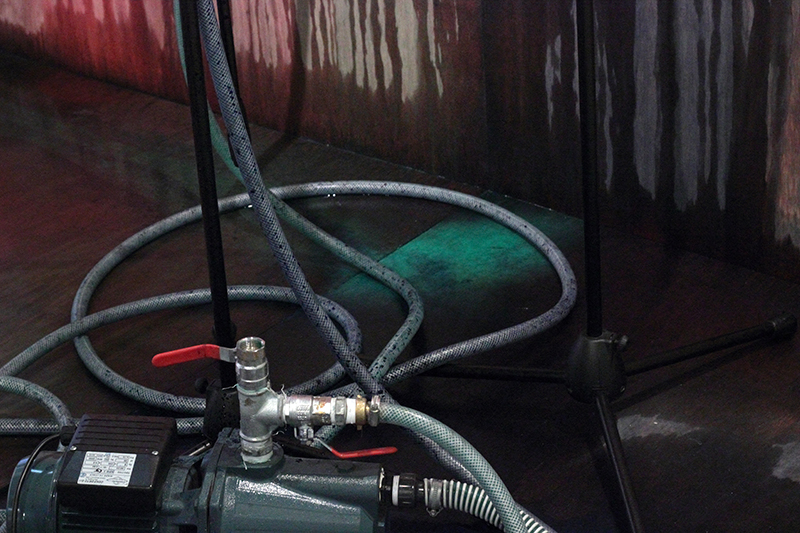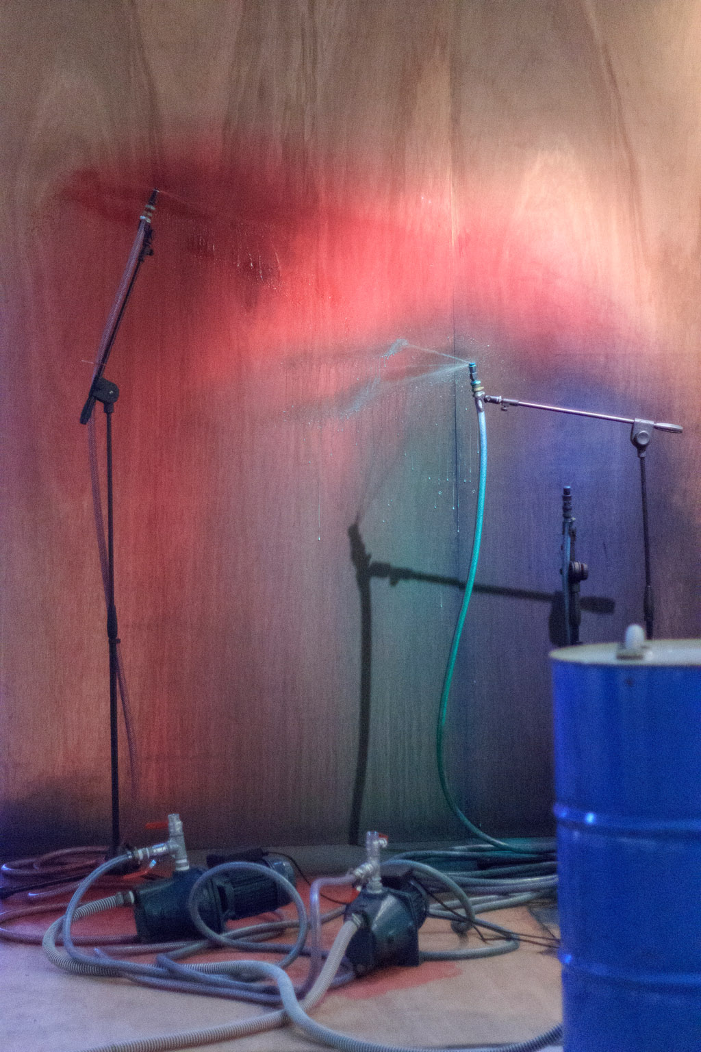 Artistic device : 3 Pumps, pipes, spray, 3 microphone stands, 1 programmer, 3 big containers, red, green, blue ink, a splash area.