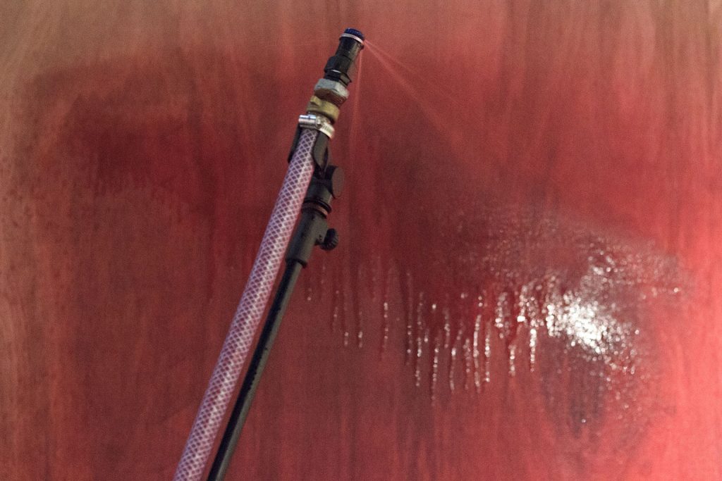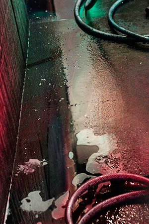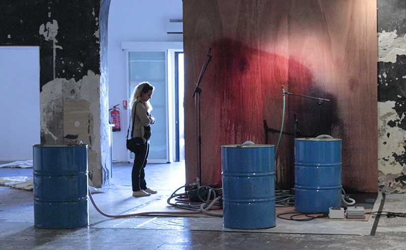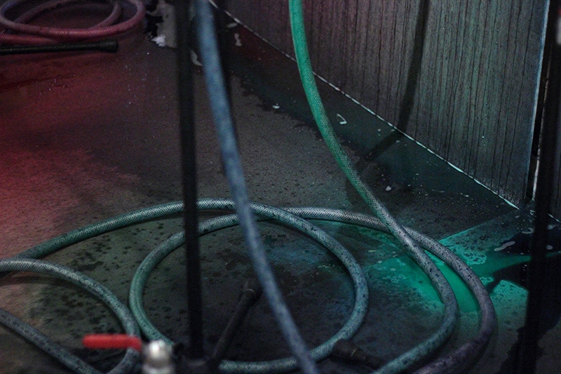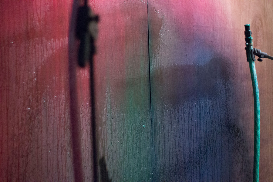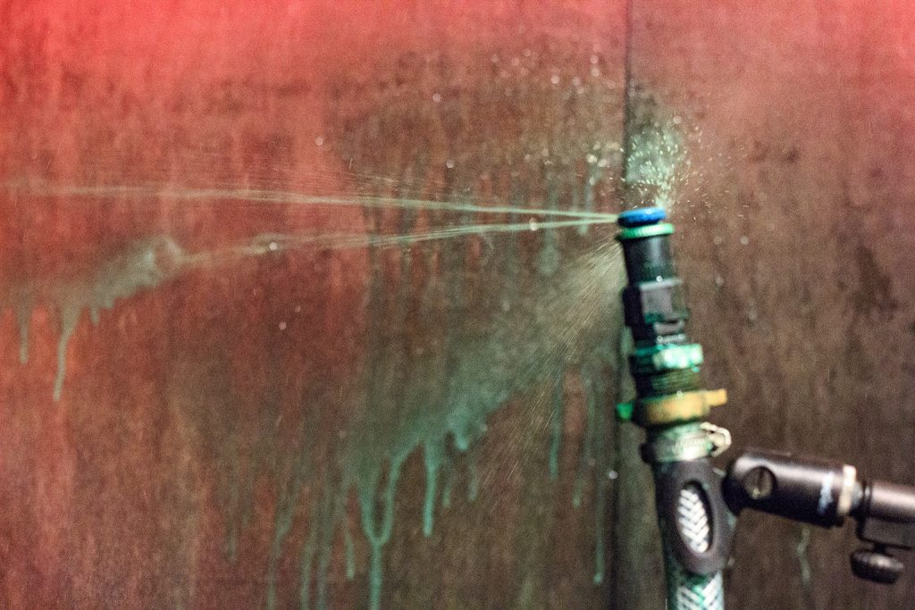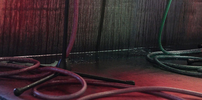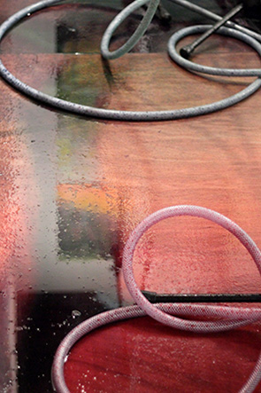 Artistic device : 3 Pumps, pipes, spray, 3 microphone stands, 1 programmer, 3 big containers, red, green, blue ink, a splash area.