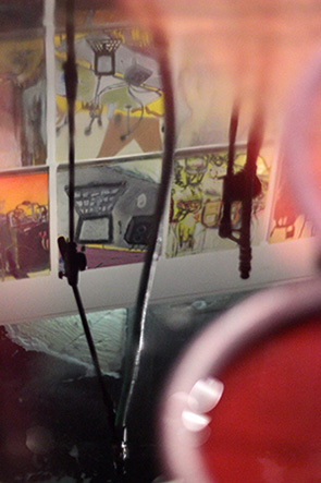 R.V.B. met en œuvre couleur, séquence, rythme, découpage, tels des éléments d’une grammaire filmique, commandant un processus pictural machiniste. La peinture projetée, s’autorisant l’aléatoire propre à sa qualité, produit alors un exposé accidentel voire événementiel.