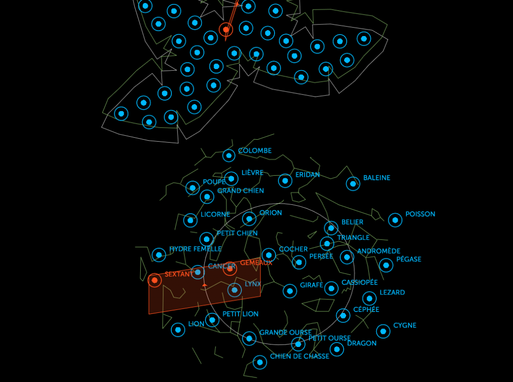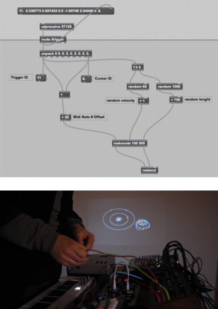 La partition musicale est générée dans IanniX, le logiciel séquenceur graphique open-source inspiré des travaux de Iannis Xenakis ! Nous disposons d’une palette d’outil (curseur, trigger, courbe) pour dessiner la partition et pour les personnes préférant coder celle-ci peut être générée en Java Script. Le séquenceur IanniX est un module de contrôle qui permet une représentation graphique et interactive du temps dans un espace 3D.
