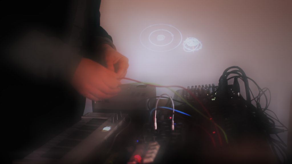Une fois la partition dessinée et le protocole de communication paramétré, la séquence programmée prend forme en son. Il s’ensuit la performance musicale. La performance consiste à organiser l’évènement acoustique produit. Mon geste intervient dans la chaine acoustique. Je route et déroute le signal audio. Je joue à partir de machines, des synthétiseurs Moog DFAM et Pittshburg modular Life Forms ! Je cherche des points de balance, de bascule, et d’équilibre. Où la machine, le geste et l’écoute entre résonance.