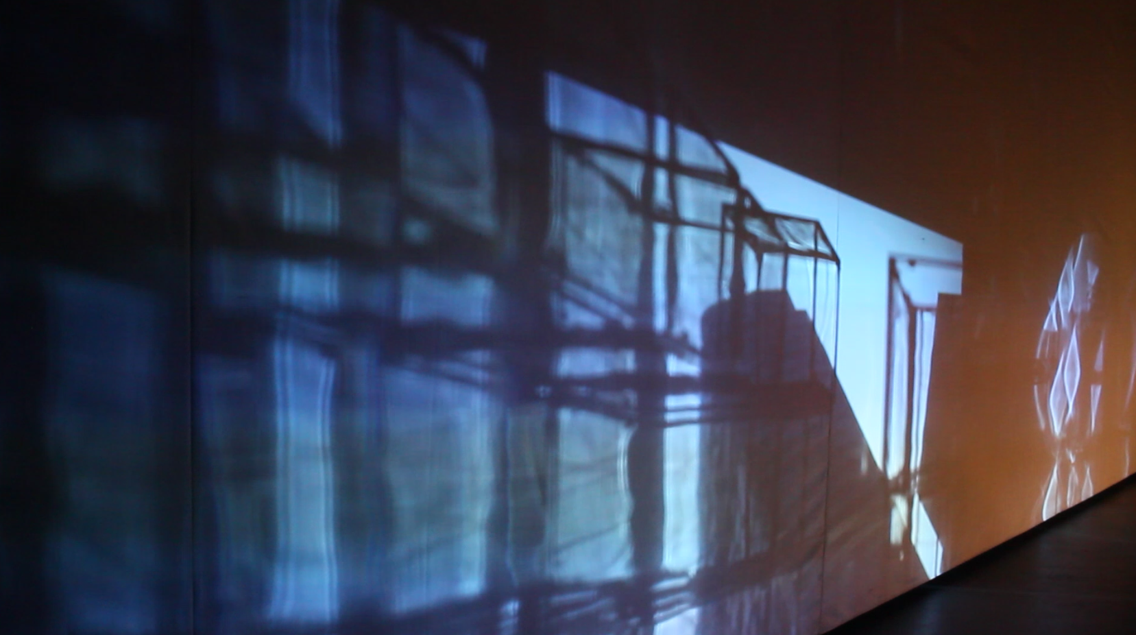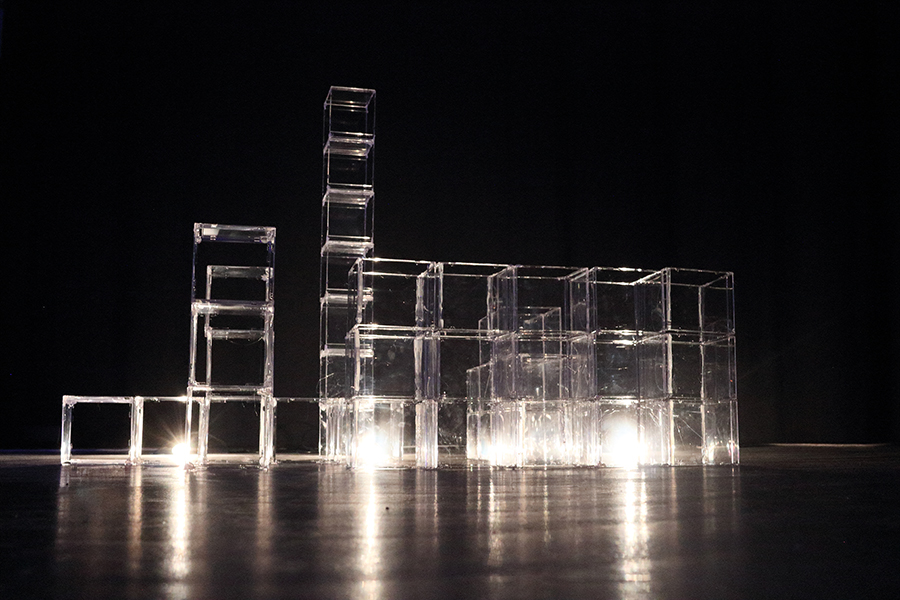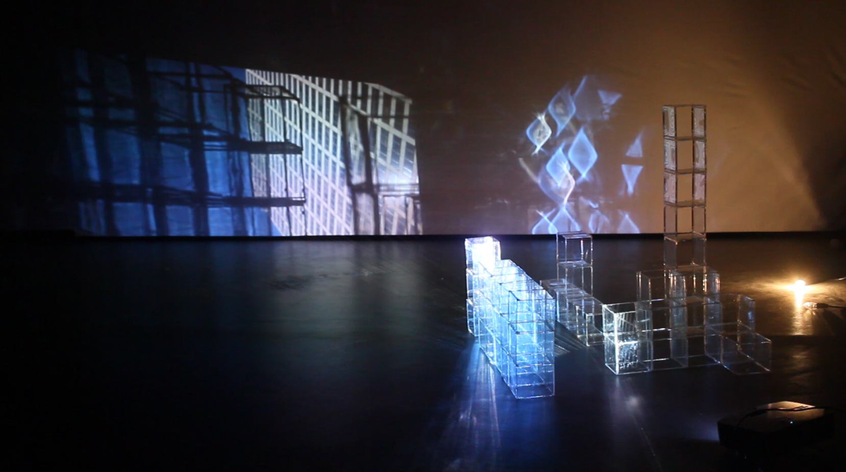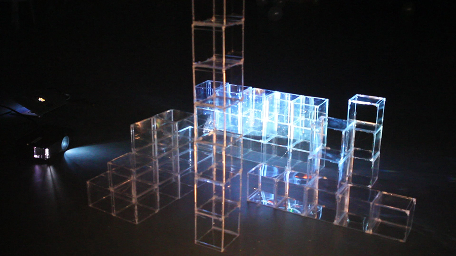 Film projeté sur maquette en boitiers CD transparents, éclairage, environnement vidéo.